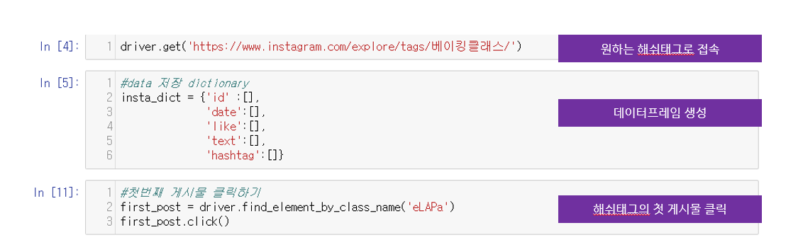 인스타그램 크롤링을 통해 얻을 수 있는 정보는 게시글의 좋아요 수, 조회 수, 댓글 수, 해쉬태그 내용, 댓글 내용, 이미지 등등,, 많습니다. 이 중에서 저는 " 아이디, 게시일자, 게시글 좋아요 수, 본문 텍스트, 본문 해쉬태그" 를 수집하기로 했습니다. 아이디를 수집해야하는 이유는 위에 기술한 것 중에 2번 목적 때문입니다. 인기 게시물에 자주 노출되는 계정이 '홈베이킹 서적'을 내거나 '유튜브 채널'을 운영하는지, '몇 명의 팔로워를 가지고 있는지' 궁금했기 때문이죠.