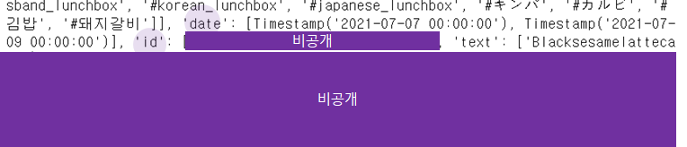 크롤링한 결과물을 뽑아 보았더니 hashtag 들은 모두 수집된 것에 반해, date, timestamp, id, text 요소들은 2개씩만 크롤링 되었습니다.